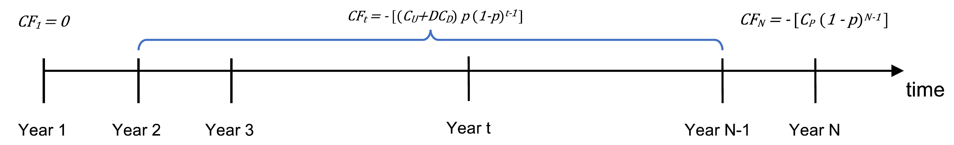 To illustrate downtime, assume shutdown costs of C_D per day. The expected downtime cost in year t=1,\ldots,N-1 is: